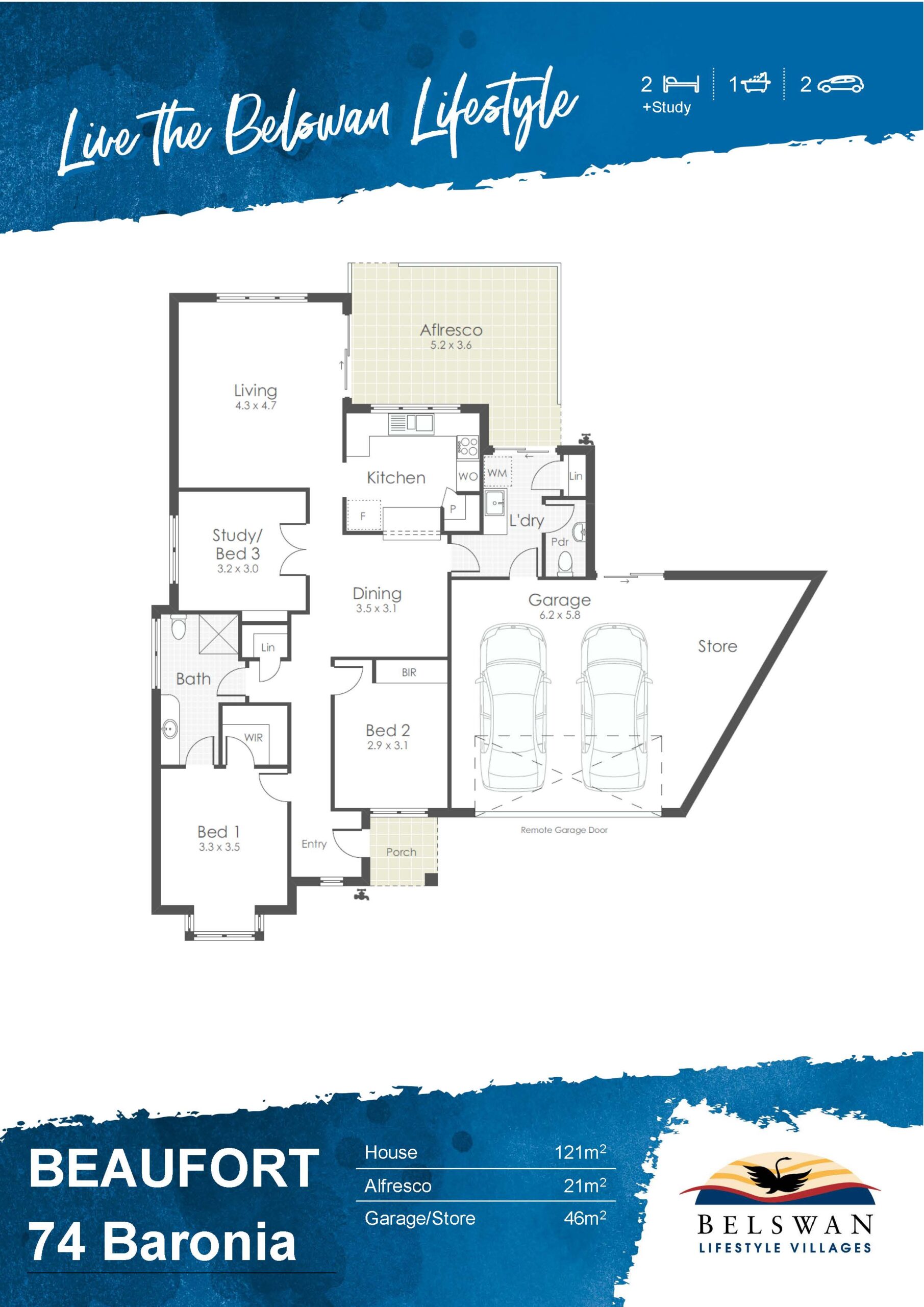 Set on one of the largest blocks in the village, this substantially refurbished ‘Beaufort’ offers 121sqm of well-designed space plus a generous 46sqm garage. The home provides an expansive garden area rarely found in village living – perfect for the garden enthusiasts. The inside of the home features 2 bedrooms plus a study, semi-ensuite off the main bedroom and an additional powder room.